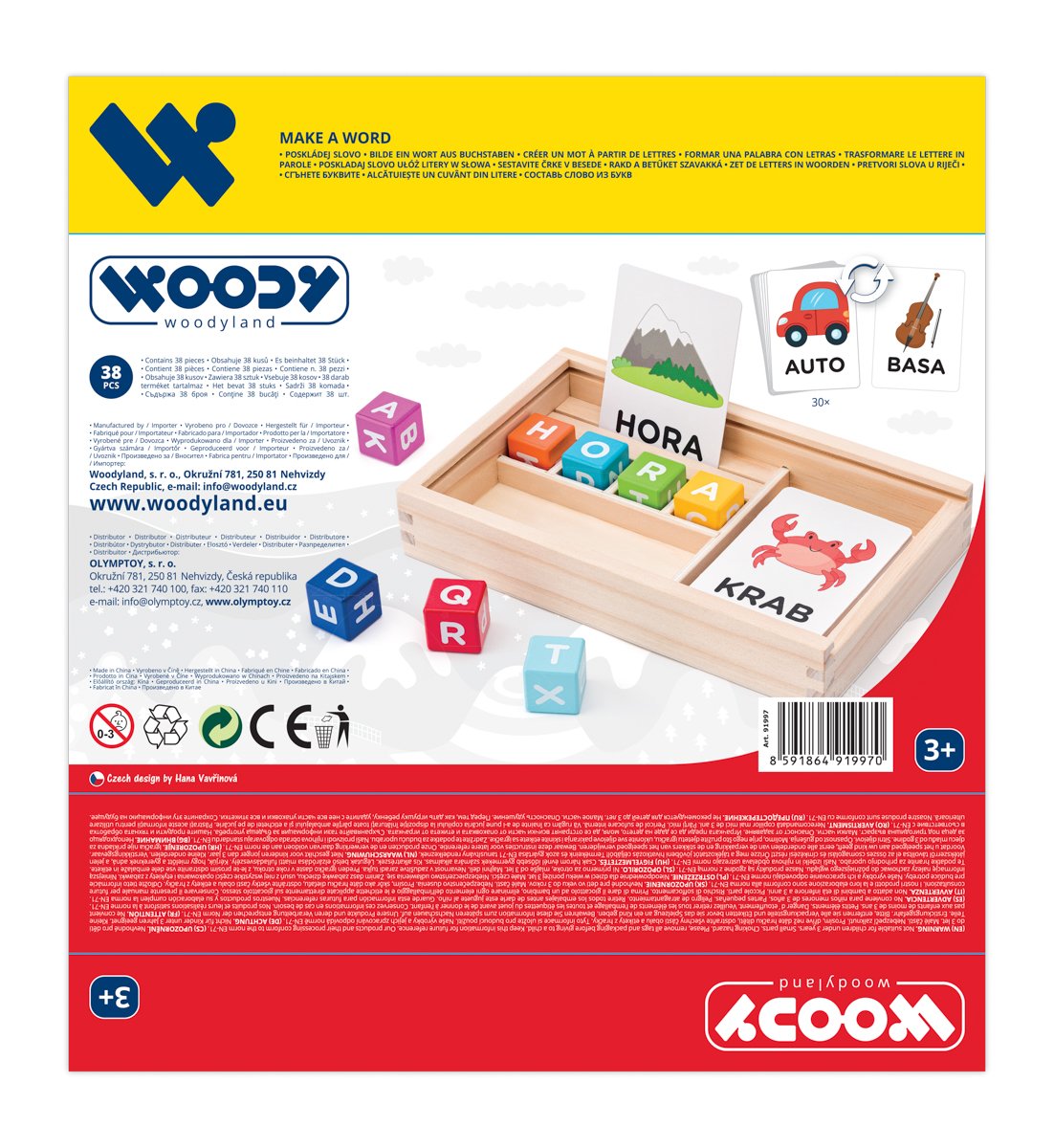Tato hra patří mezi první formy smysluplného poznávání písmen a skládání slov. Dítě si vybere obrázek s krátkým názvem a zasune ho do stojánku. Na barevných kostičkách se pak snaží najít jednotlivá písmena a správně je poskládat. Hračka je dílem českého výtvarníka.| Rozměr výrobku: 23 x 14 x 3,9 cm