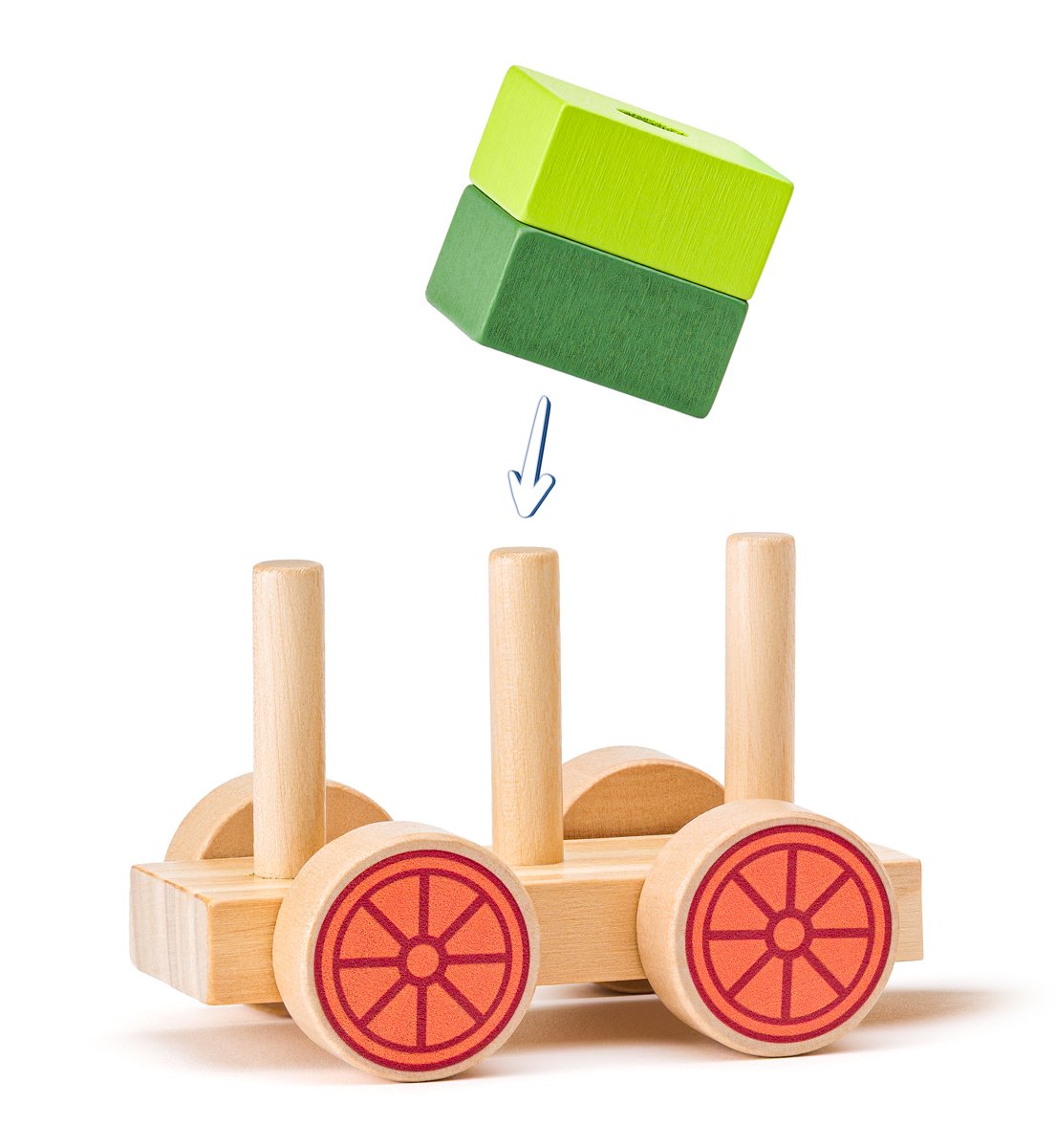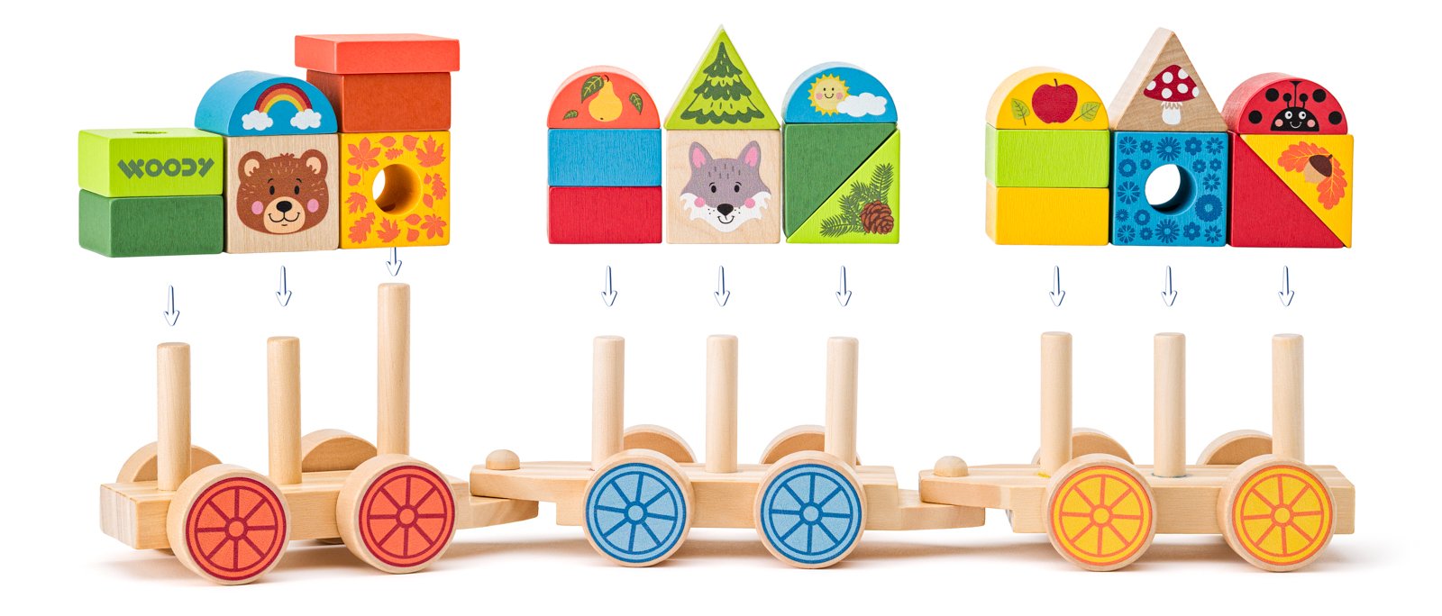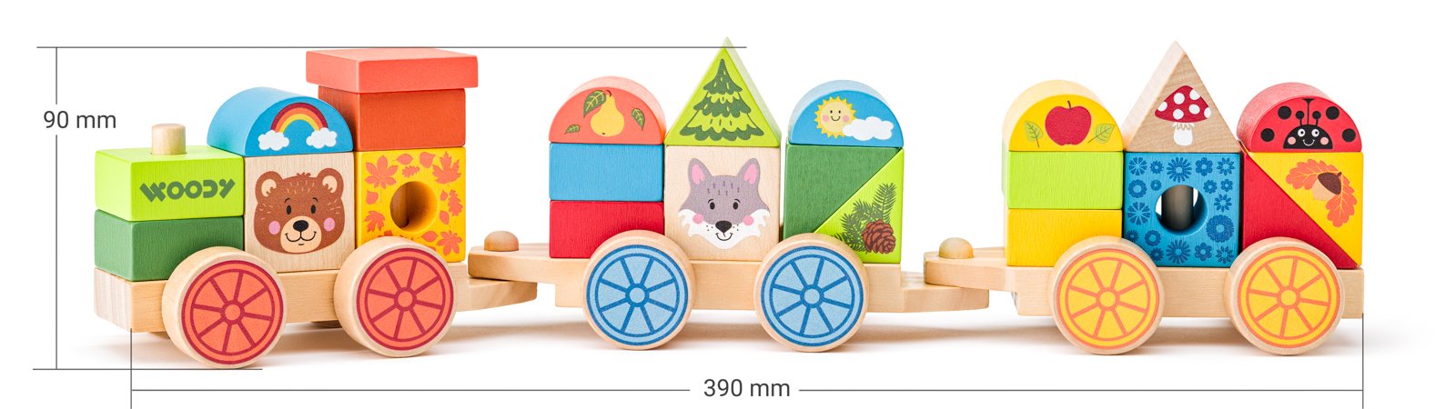 která spojuje skládání, stavění i tahání v jednom. Dřevěný vláček se skládá z lokomotivy a dvou vagónků, které lze spojovat a rozpojovat. Každý dílek zdobí motivy lesa – medvídek, vlk, beruška, houba, strom, jablíčko, šiška, sluníčko, duha i podzimní listí. Děti si při hře rozšiřují slovní zásobu, poznávají barvy, tvary i zvířátka. Hračka podporuje rozvoj jemné motoriky, koordinace ruka-oko, logické myšlení a prostorovou představivost. Skládací kostky mají různé rozmanité tvary. Díky kolíkům na podvozku děti skládají jednotlivé díly na sebe, kombinují je a vytvářejí vlastní varianty vagónků. Vyrobeno z kvalitního borovicového a jalovcového dřeva. Stabilní konstrukce, hladké opracování a zaoblené hrany zajišťují bezpečné hraní. Vláček je ideálním dárkem pro malé objevitele, kteří rádi staví, skládají a vydávají se na dobrodružství do lesa. Obsahuje 26 dílů. Rozměry hračky: 9,5 x 7,5 x 38 cm. Rozměry balení: 9,5 x 8,5 x 40 cm. Věk: 18 m+